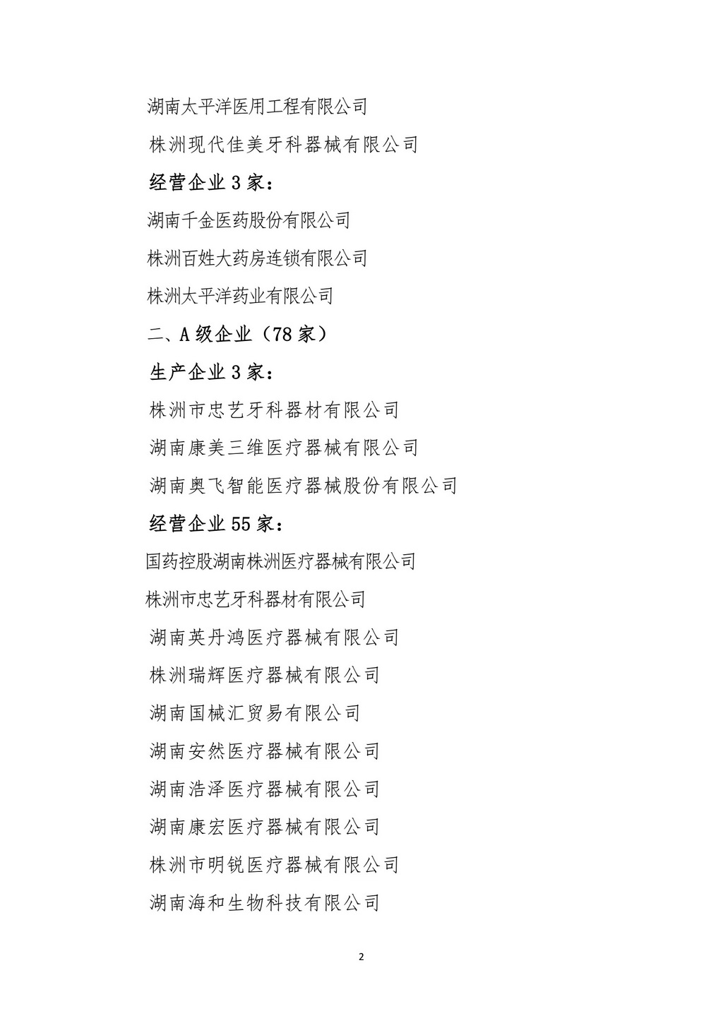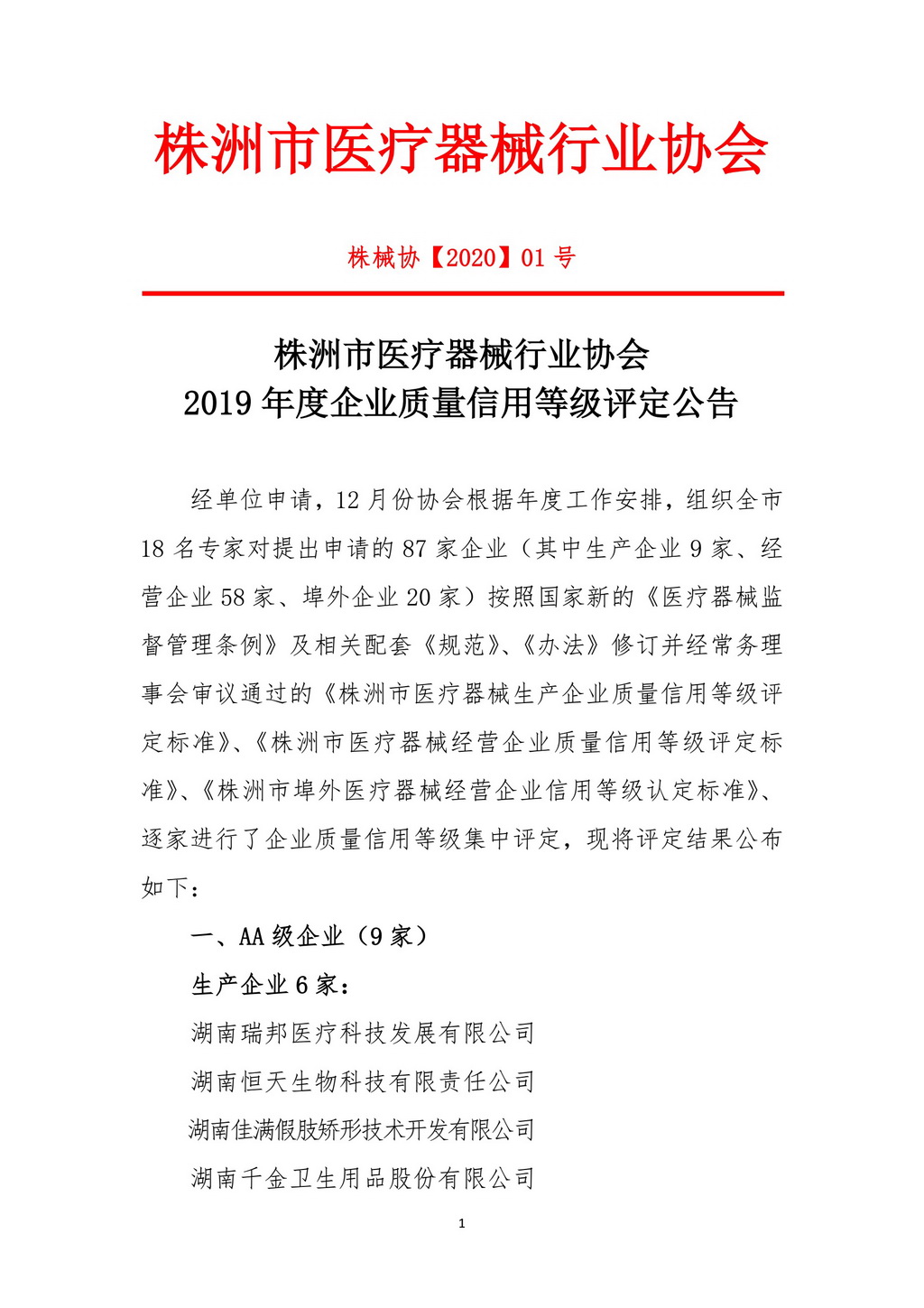 株洲市醫(yī)療器械行業(yè)協(xié)會2019年度企業(yè)質(zhì)量信用等級評定公告